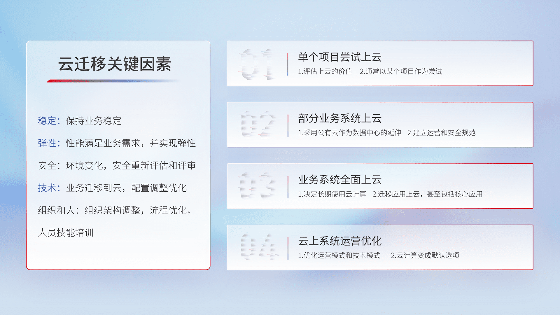 结合实际业务,,从规划设计、、云平台选型、、云原生改造、、、数据迁移、、、、集成交付,,迁移全过程为客户识别最佳上云路径,,,,做好风险识别管理,,,设计网络架构、、身份权限、、、、安全审计合规、、操作审计、、日志审计、、、、监控告警策略、、多站点容灾设计等,,对云上基础设施进行整体规划,,提升IT治理水平,,,以满足弹性、、高可用、、高性能的需求。。。。