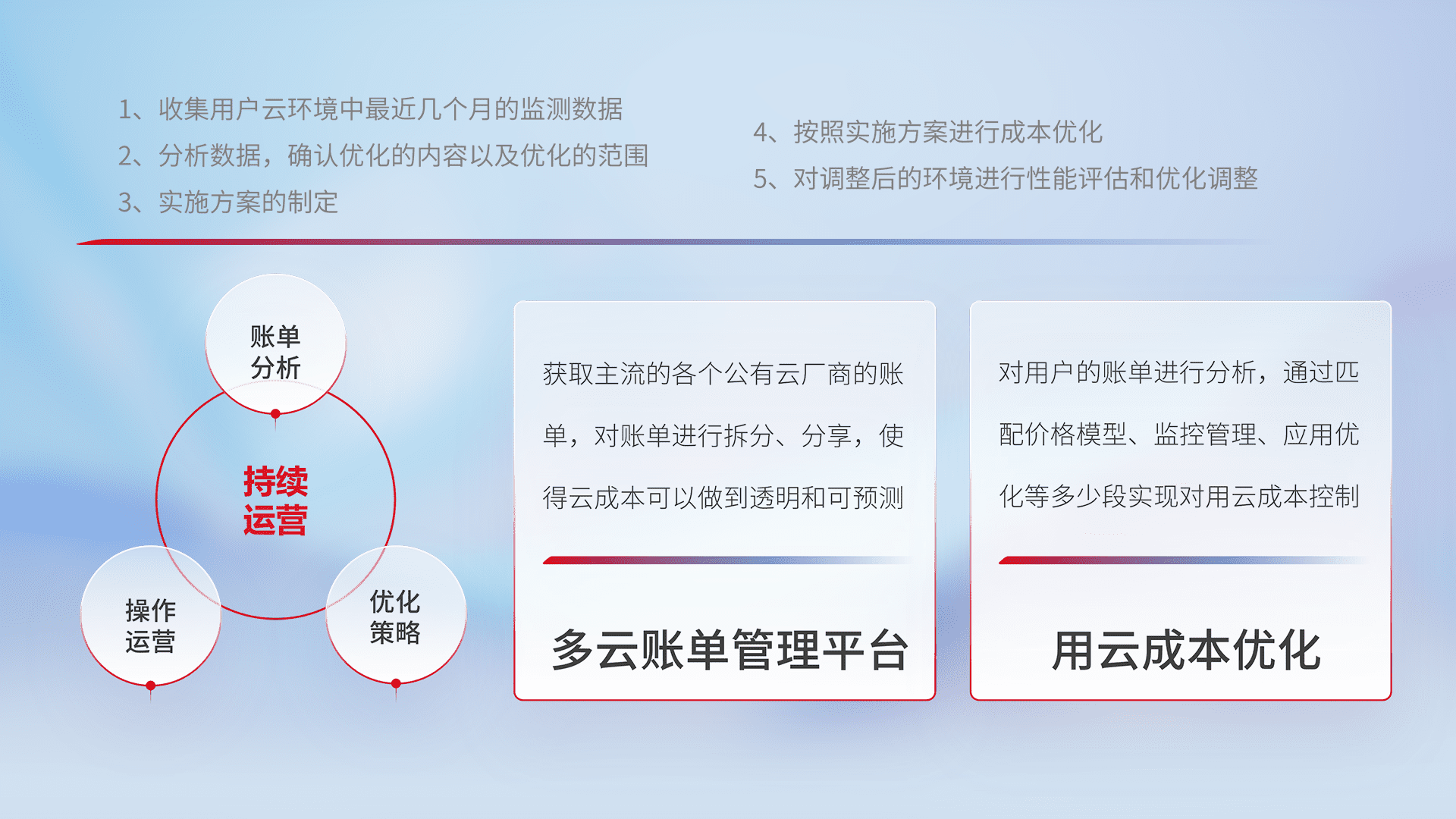 通过多云纳管,,,以统一的资源数据模型把客户的云资源进行抽象和封装,,,进而实现对多云资源的统一操作,,,保障云资源管理的可靠性、、、、稳定性与可用性。。。量身定制化运维内容,,,配置、、、开发运维、、、、补丁管理、、备份、、、监控、、认证和访问管理、、、审计和日常巡检等,,保障在用云过程中的可靠度,,,,稳定度以及高可用率。。。