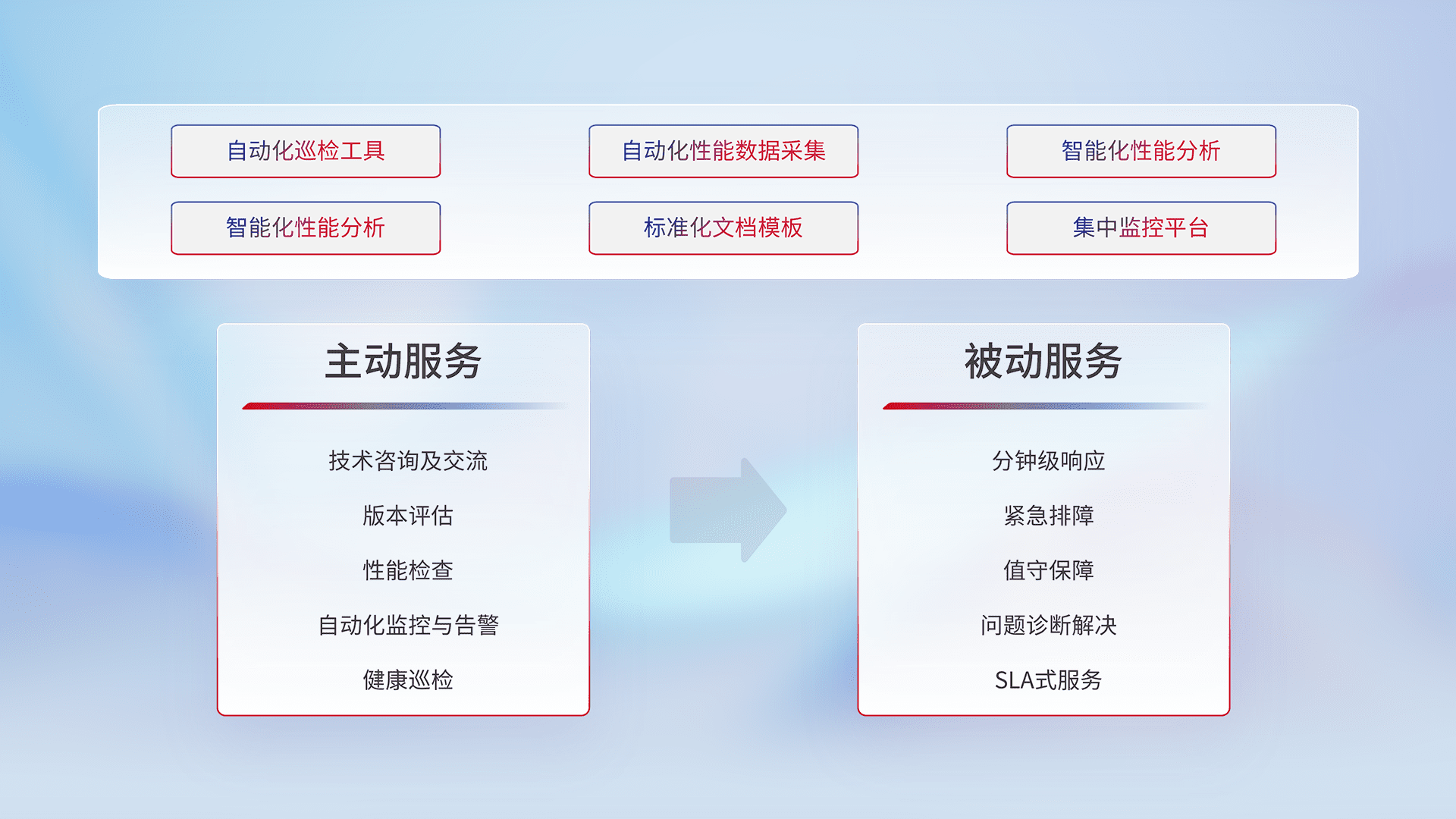 智能化工具和标准化文档,,,,保障服务质量,,,,提供主动服务(包含技术咨询、、、版本评估、、性能检查、、、、自动化监控与告警、、、健康巡检)和被动服务包含(分钟级响应、、紧急排障、、、值守保障、、、、问题诊断解决、、、SLA服务)。。。。